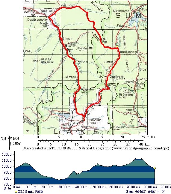 A Saturday ride with Ed Porrit. Left Boulder at 5:45 am to park at Copper Mnt. Clockwise circuit heading up towards Leadville, Minturn, Vail and back. 80 miles on the nose with 5900 feet of climbing. Great weather the whole way. Awesome downhill between Tennessee Pass and Minturn! Long climb up to vail Pass to top it off.