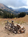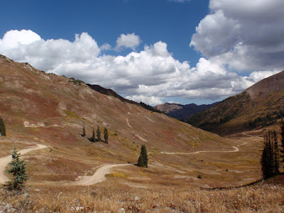 The map made the road riding look pretty tame but that was deceptive. It's a steep stretch up out of Paradise Basin and to the pass that looks down on the Slate River Valley. What a nice ride despite the work! Incredible, colorful slopes all around and, for a prime leaf peeping fall weekend, few people. The top of the road ride gains grand views of the Slate River drainage and the peaks over in the Raggeds Wilderness. The dimensions are Alps-like in scale.
