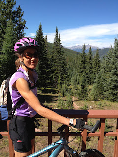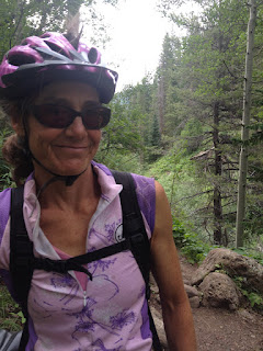 Then the trail started side hilling as the valley constricts along the creek. Not bad but in many places, a slip the wrong way means a tumble down a steep slope. Ooops. Rachel tumbled. And pretty for real too. Somersault down a 45 degree slope, clipped to the pedals. Ouch. Handle bar in the lower left ribs. Shocky, nauseous. Scary. Took a while to get things sorted and to evaluate whether Rach could get back on the bike. Not too good. Pretty gingerly motion on her part. I opted to ride down to the last lift before the 5 miles of back country to Minturn and see if a lifty was around to call ski patrol. Sure enough, there was and he radioed for them to come out and take a look at Rach. Ran back up the hill to help get the bike and Rach down.