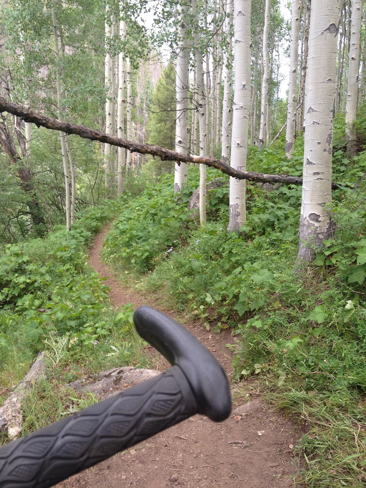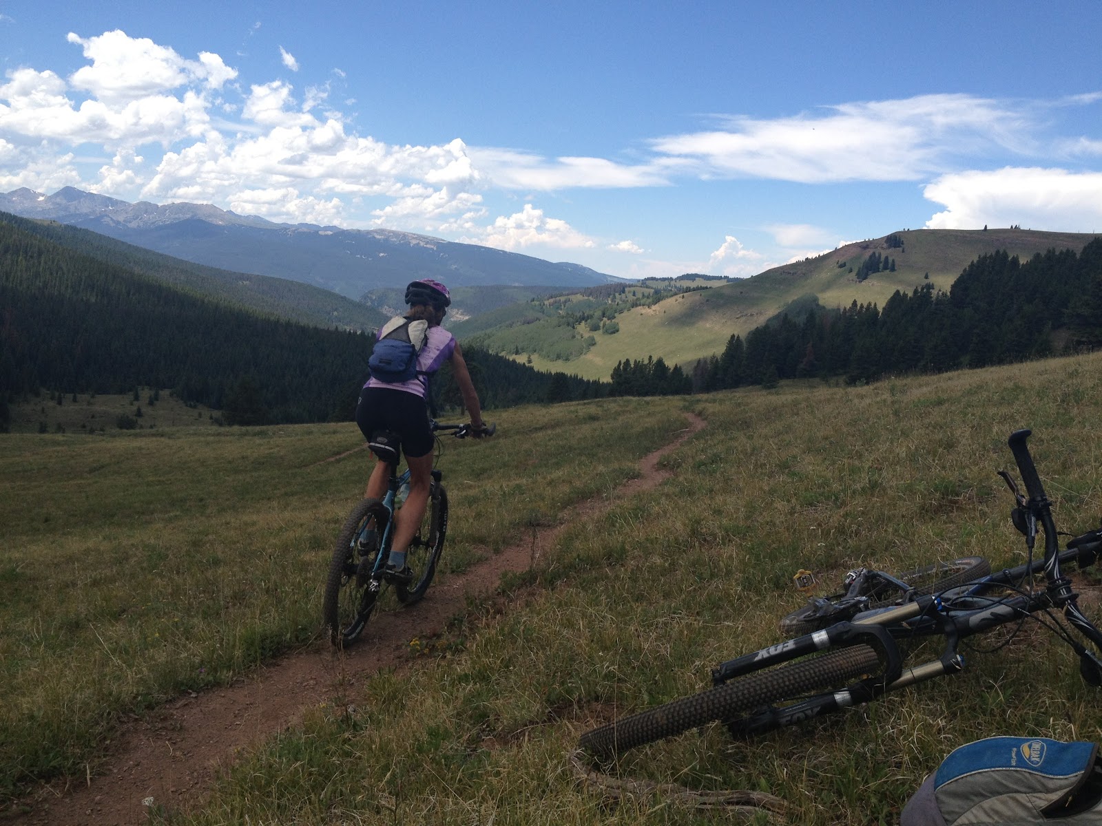 With clouds building, but no worries since we were off the ridge from here on out, we headed down the Two Elks trail towards Minturn. This was not on the original agenda so no knowledge of what this trail would bring. Well, initially it brought pretty cool single track winding down through the meadows below Outer Mangolia and Blue Sky Basin. Very cool!