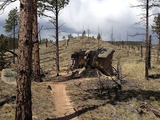 After picking up an electric lawn mower down near the old Staapleton area ($100 for a $330 machine!! via a Clean Air program), Rach and I headed up 285 to hit the sweet, flowy single track of Buffalo Creek. We did the same loop we've done before: started at Pine Valley, climbed the western trail up, across Homestead, up the road, looped up Sawmill, up Baldy and down Strawberry.